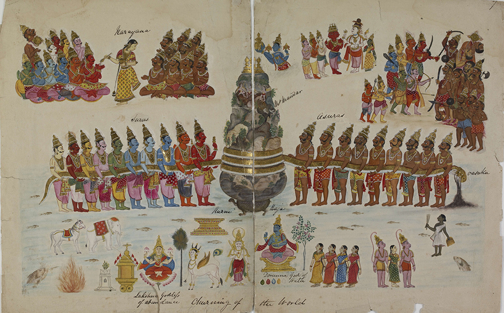 The Library of Shadows shares four puppets from Samudra Manthan, a popular Hindu epic that tells the story of the eternal struggle between the gods (devas) and demons (asuras). The gods, having lost their power, ask the demons to help them obtain an elixir of immortality (Amrita), so as to regain their powers. To do so, the gods and demons must work with a large snake named Vasuki to churn a cosmic ocean of milk. In the process, treasures bubble to the surface, including a wish-fulfilling cow named Kamadhenu, a four tusked elephant named Airavata, and a winged horse named Uchchaihshravas. While the gods eventually obtain the elixir, the demons also get a small portion, which is why the struggle between good and evil remains till this day.
